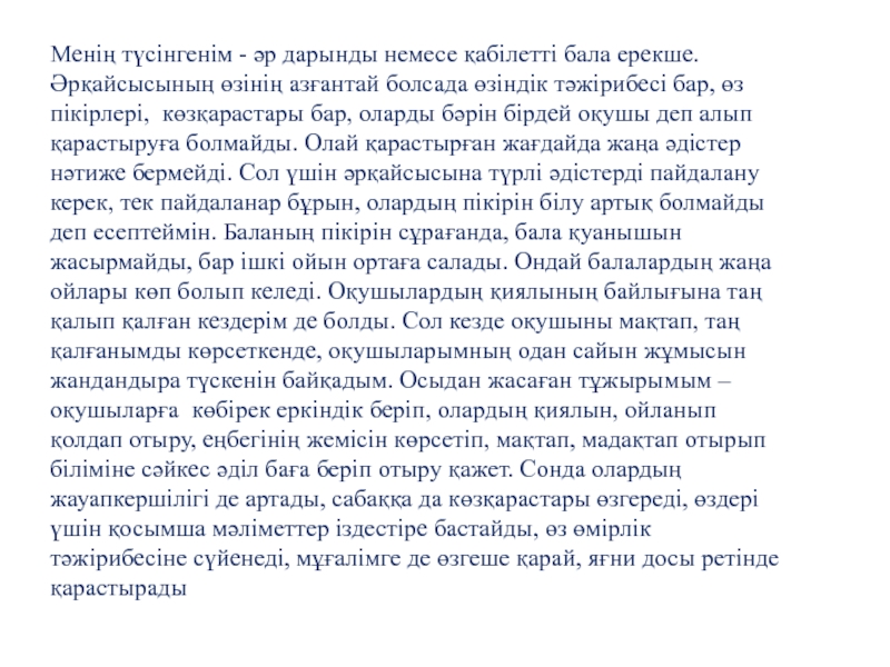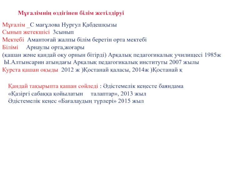 жаңартып,сындарлы оқыту технологиясын енгізуге «Назарбаев Зияткерлік мектебі» мен «Кембридж университеті» бірлесіп жасаған Бағдарламасы негізінде үш деңгейдегі курсын айта аламын. Бағдарламада көрсетілген жеті модульдің өзіндік ерекшеліктерін әр зерттеуші талқылап, өзіндік тәжірбиесімен ой бөлісіп, қорытынды ой түйіндеп, арнайы сілтемелер берілген. Сол сілтемелер қазіргі жаңашыл мұғалімнің шеберлігін арттыру жолында бағыт-бағдар бере алады. Оқушыларымның білімді , ел абыройын көтерер азамат болса екен деп армандайтын көп ұстаздың бірімін. «Оқушым білімді,білікті болуы үшін тағы қандай әдіс –тәсілді меңгерсем,