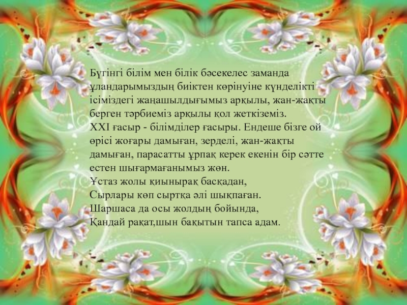 ХХІ ғасыр - білімділер ғасыры. Ендеше бізге ой өрісі жоғары дамыған, зерделі, жан-жақты дамыған, парасатты ұрпақ керек екенін бір сәтте естен шығармағанымыз жөн.