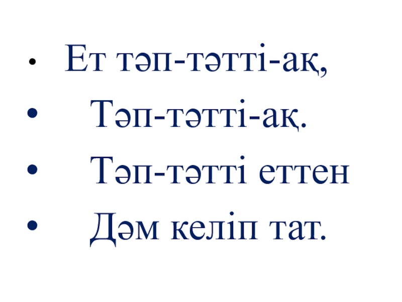 Ет тәп-тәтті-ақ,   Тәп-тәтті-ақ.   Тәп-тәтті еттен   Дәм келіп тат.
