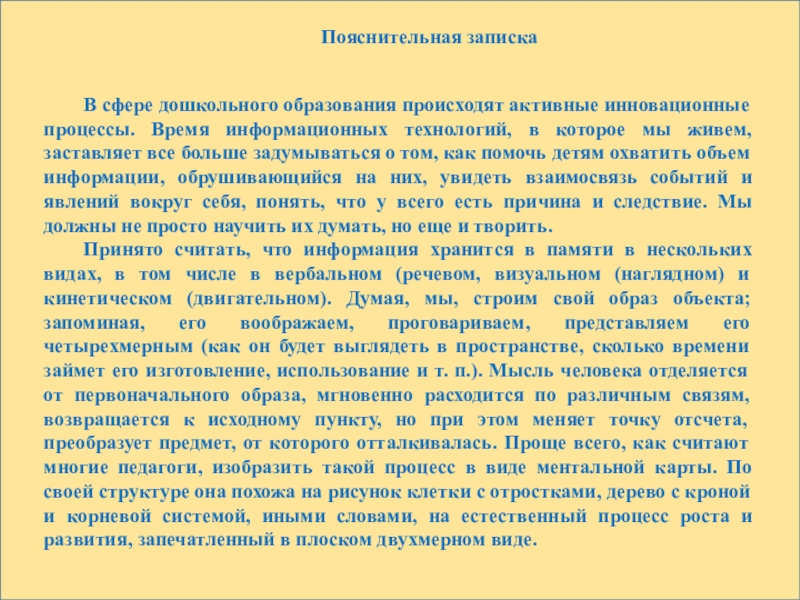 Принято считать, что информация хранится в памяти в нескольких видах, в том числе в вербальном (речевом, визуальном (наглядном) и кинетическом (двигательном). Думая, мы, строим свой образ объекта; запоминая, его воображаем, проговариваем, представляем его четырехмерным (как он будет выглядеть в пространстве, сколько времени займет его изготовление, использование и т. п.). Мысль человека отделяется от первоначального образа, мгновенно расходится по различным связям, возвращается к исходному пункту, но при этом меняет точку отсчета, преобразует предмет, от которого отталкивалась. Проще всего, как считают многие педагоги, изобразить такой процесс в виде ментальной карты. По своей структуре она похожа на рисунок клетки с отростками, дерево с кроной и корневой системой, иными словами, на естественный процесс роста и развития, запечатленный в плоском двухмерном виде.