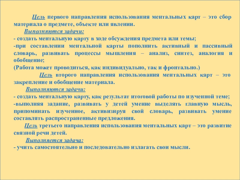 -при составлении ментальной карты пополнить активный и пассивный словарь, развивать процессы мышления – анализ, синтез, аналогия и обобщение;