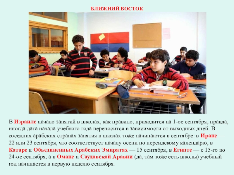 на 1-ое сентября, правда, иногда дата начала учебного года переносится в зависимости от выходных дней. В соседних арабских странах занятия в школах тоже начинаются в сентябре: в Иране — 22 или 23 сентября, что соответствует началу осени по персидскому календарю, в Катаре и Объединенных Арабских Эмиратах — 15 сентября, в Египте — с 15-го по 24-ое сентября, а в Омане и Саудовской Аравии (да, там тоже есть школы) учебный год начинается в первую неделю сентября.