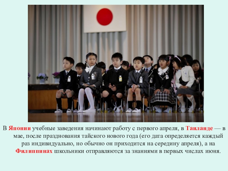 Слайд 11В Японии учебные заведения начинают работу с первого апреля, в Таиланде