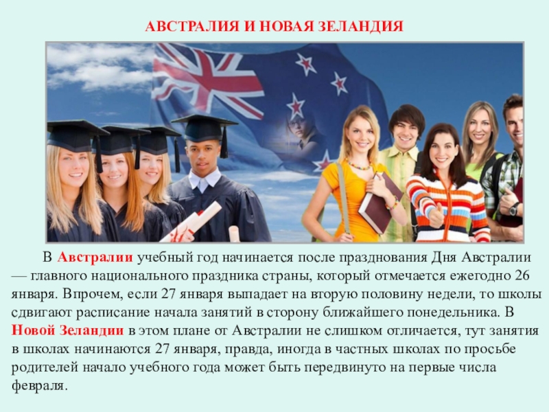 празднования Дня Австралии — главного национального праздника страны, который отмечается ежегодно 26 января. Впрочем, если 27 января выпадает на вторую половину недели, то школы сдвигают расписание начала занятий в сторону ближайшего понедельника. В Новой Зеландии в этом плане от Австралии не слишком отличается, тут занятия в школах начинаются 27 января, правда, иногда в частных школах по просьбе родителей начало учебного года может быть передвинуто на первые числа февраля.