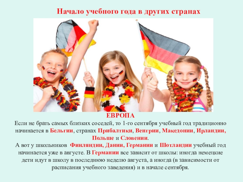 А вот у школьников Финляндии, Дании, Германии и Шотландии учебный год начинается уже в августе. В Германии все зависит от школы: иногда немецкие дети идут в школу в последнюю неделю августа, а иногда (в зависимости от расписания учебного заведения) и в начале сентября.