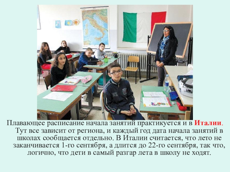 Слайд 8Плавающее расписание начала занятий практикуется и в Италии. Тут все зависит