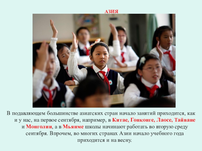 у нас, на первое сентября, например, в Китае, Гонконге, Лаосе, Тайване и Монголии, а в Мьянме школы начинают работать во вторую среду сентября. Впрочем, во многих странах Азии начало учебного года приходится и на весну.