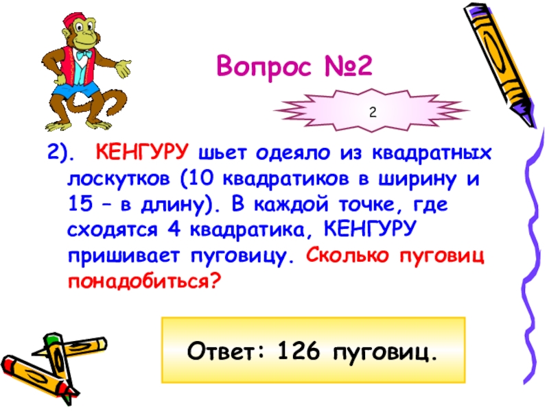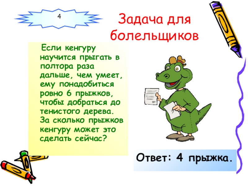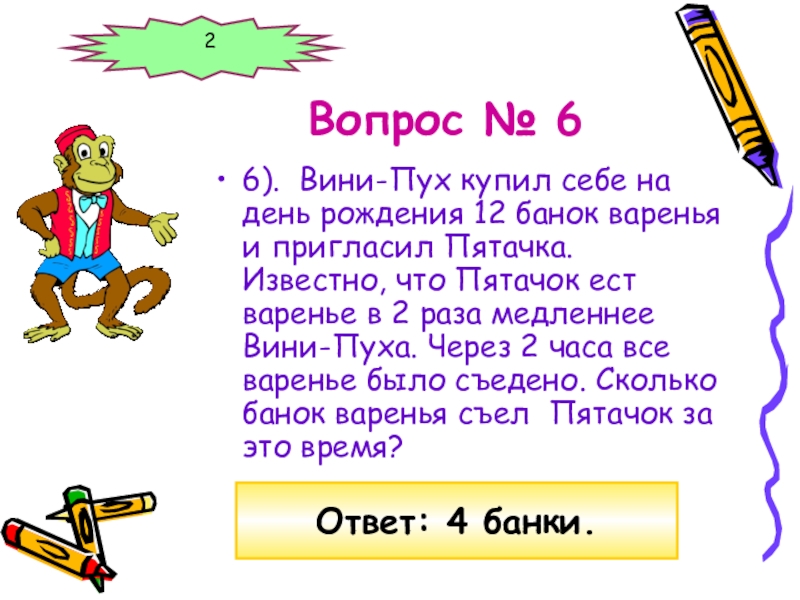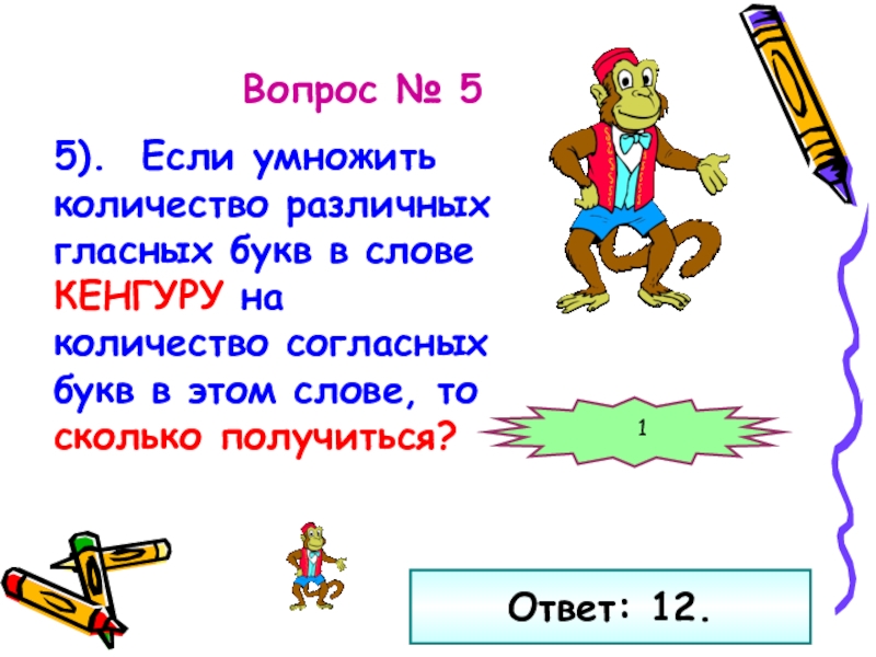 5). Если умножить количество различных гласных букв в слове КЕНГУРУ на количество согласных букв в этом слове, то сколько получиться?