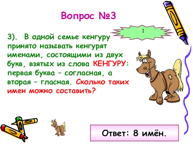 3). В одной семье кенгуру принято называть кенгурят именами, состоящими из двух букв, взятых из слова КЕНГУРУ: первая буква – согласная, а вторая – гласная. Сколько таких имен можно составить?