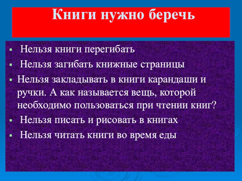 Книги нужно беречь  Нельзя книги перегибать Нельзя загибать книжные страницыНельзя закладывать в книги карандаши и ручки. А как