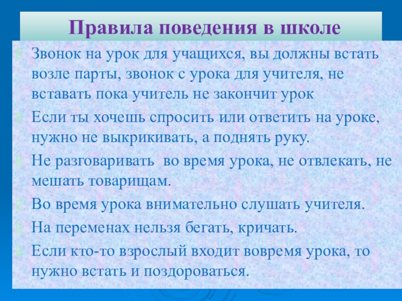Правила поведения в школеЗвонок на урок для учащихся, вы должны встать возле парты, звонок с урока для