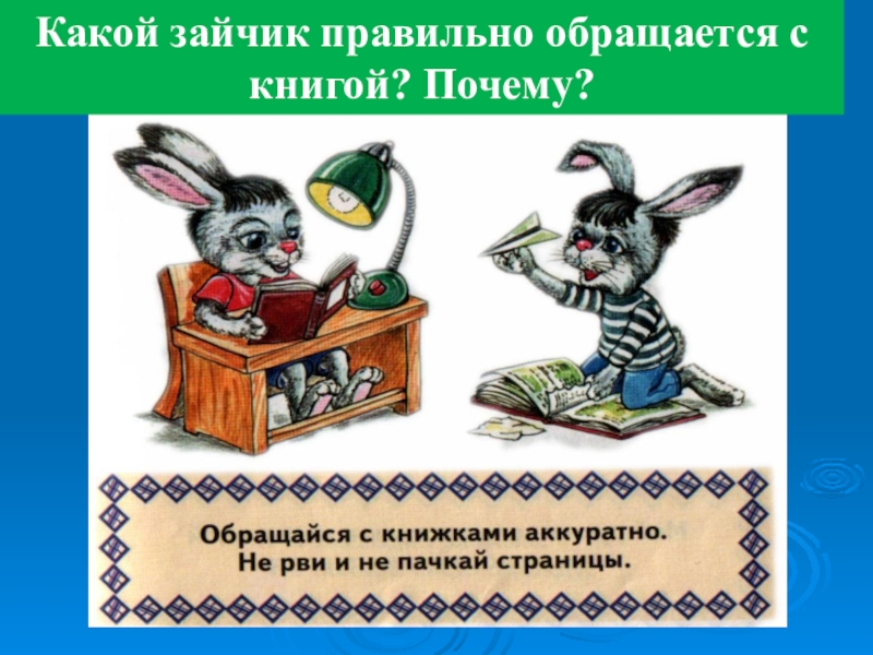 Слайд 12Какой зайчик правильно обращается с книгой? Почему?