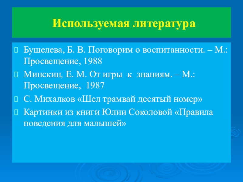 Используемая литератураБушелева, Б. В. Поговорим о воспитанности. – М.: Просвещение, 1988Минскин, Е. М. От игры к знаниям.