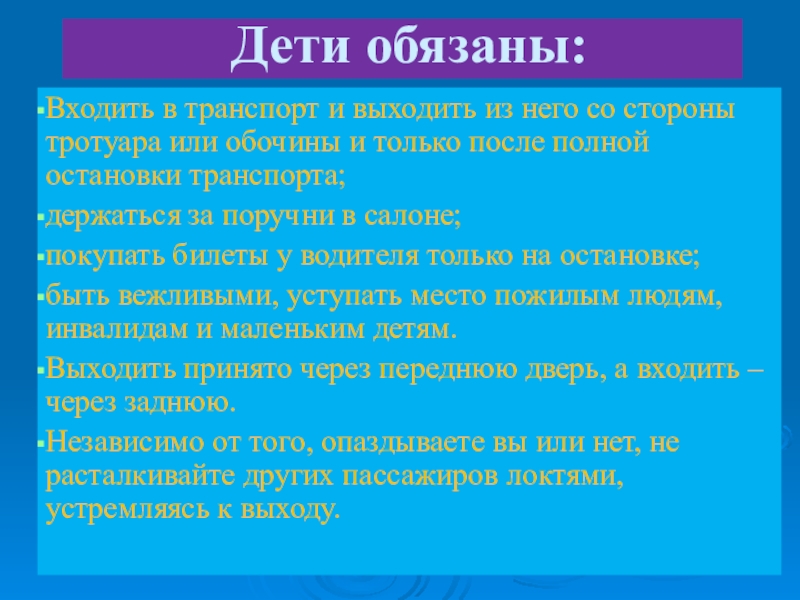 Дети обязаны:Входить в транспорт и выходить из него со стороны тротуара или обочины