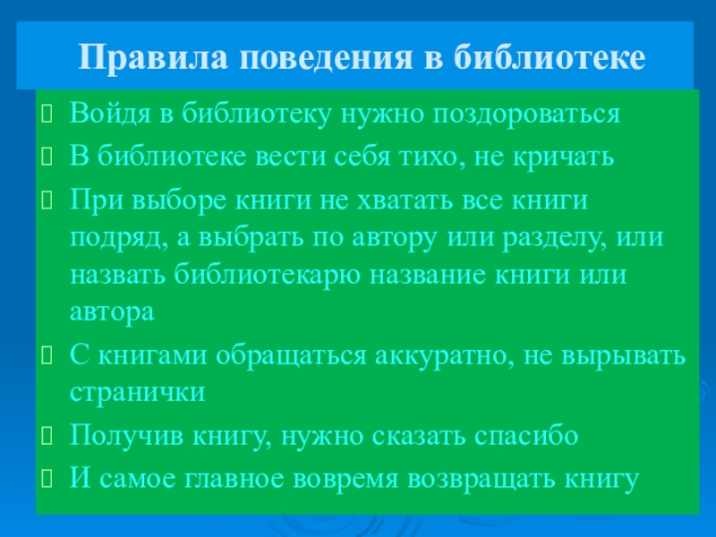 Правила поведения в библиотекеВойдя в библиотеку нужно поздороватьсяВ библиотеке вести себя тихо, не кричатьПри выборе книги не
