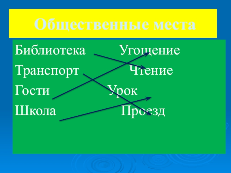 Общественные местаБиблиотека Угощение Транспорт Чтение Гости УрокШкола Проезд