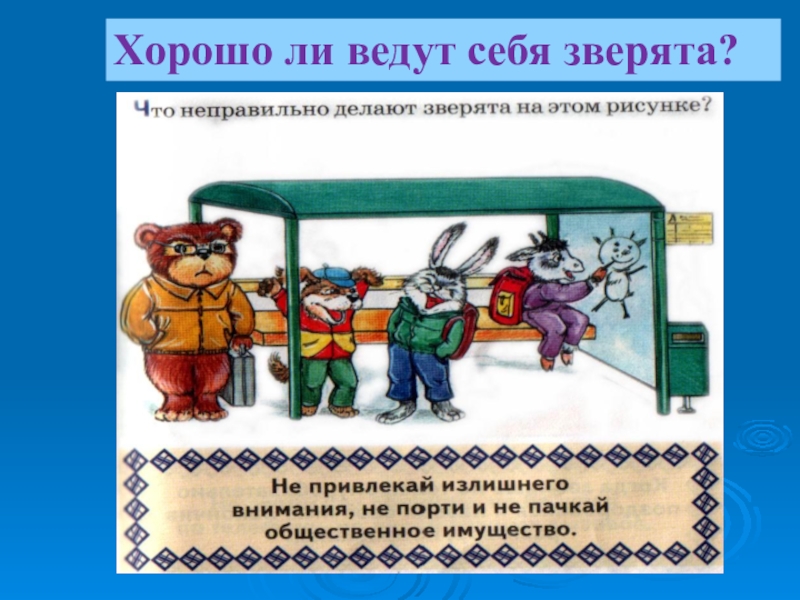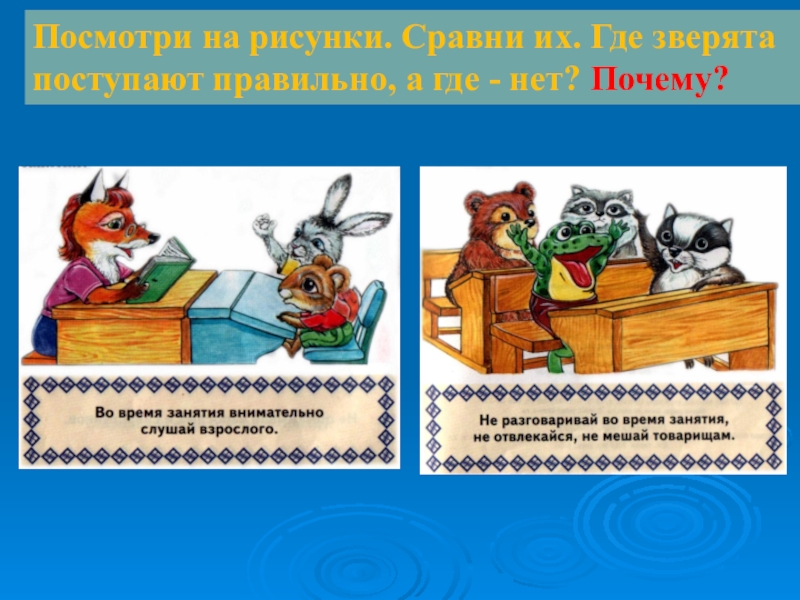 Слайд 16Посмотри на рисунки. Сравни их. Где зверята поступают правильно, а где