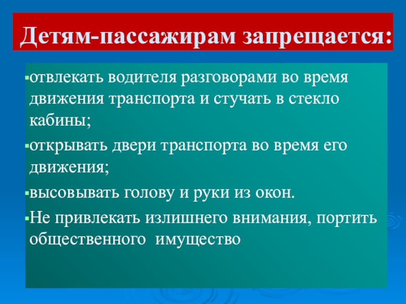 Детям-пассажирам запрещается:отвлекать водителя разговорами во время движения транспорта и стучать в стекло кабины;открывать двери транспорта во