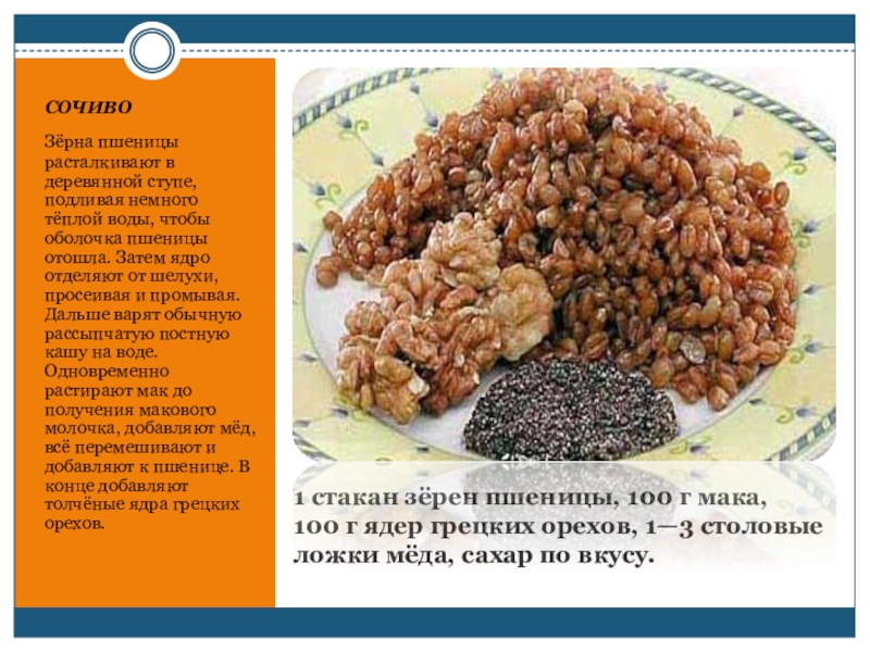 Зёрна пшеницы расталкивают в деревянной ступе, подливая немного тёплой воды, чтобы оболочка пшеницы отошла. Затем ядро отделяют от шелухи, просеивая и промывая. Дальше варят обычную рассыпчатую постную кашу на воде. Одновременно растирают мак до получения макового молочка, добавляют мёд, всё перемешивают и добавляют к пшенице. В конце добавляют толчёные ядра грецких орехов.