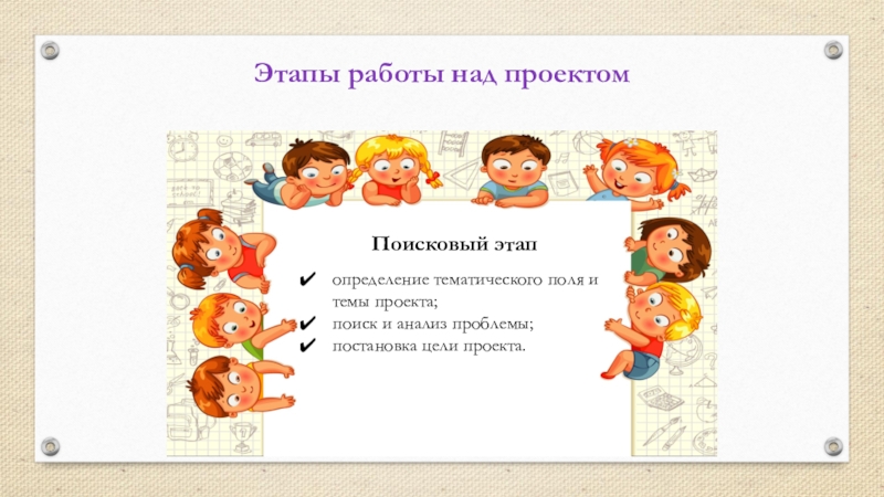 Поисковый этапЭтапы работы над проектомопределение тематического поля и темы проекта;поиск и анализ проблемы;постановка цели проекта.