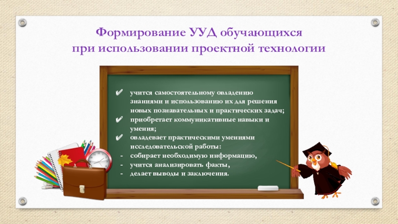 Формирование УУД обучающихсяпри использовании проектной технологииучится самостоятельному овладению знаниями и использованию их для решения новых познавательных и