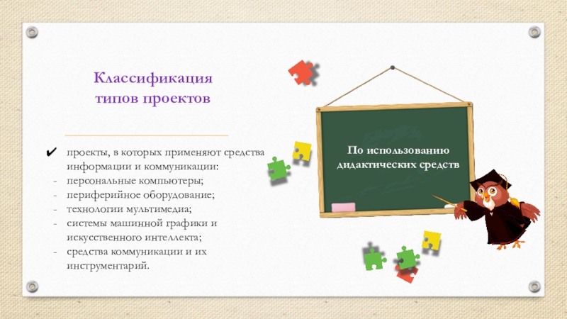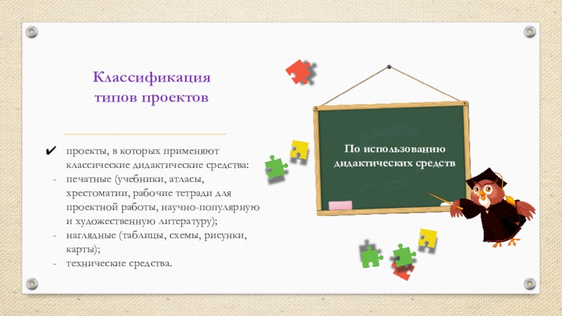 Классификация типов проектовпроекты, в которых применяют классические дидактические средства:печатные (учебники, атласы, хрестоматии, рабочие тетради для проектной работы,