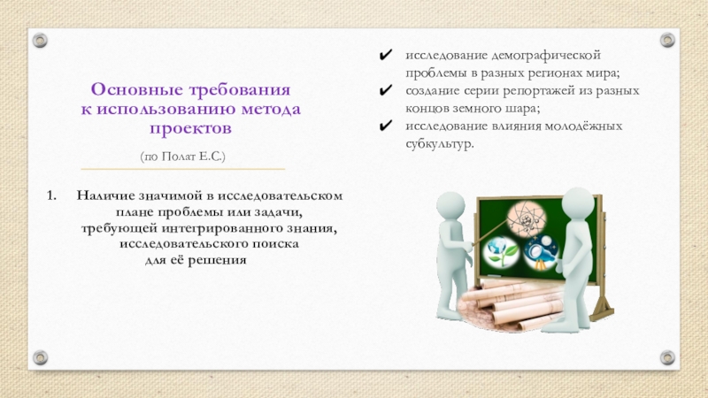 Основные требования к использованию метода проектов(по Полат Е.С.) 5. Использование исследовательских методов, предусматривающих определённую последовательность действийопределение проблемы