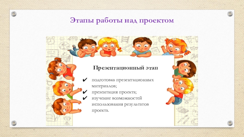 Презентационный этапЭтапы работы над проектомподготовка презентационных материалов;презентация проекта;изучение возможностей использования результатов проекта.