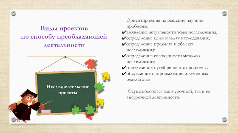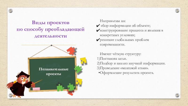 Виды проектов по способу преобладающей деятельностиНаправлены на: сбор информации об объекте;конструирование процесса и явления в конкретных условиях;решение