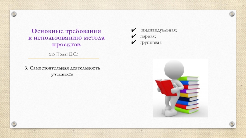 Основные требования к использованию метода проектов(по Полат Е.С.) 3. Самостоятельная деятельность учащихся индивидуальная;парная;групповая.
