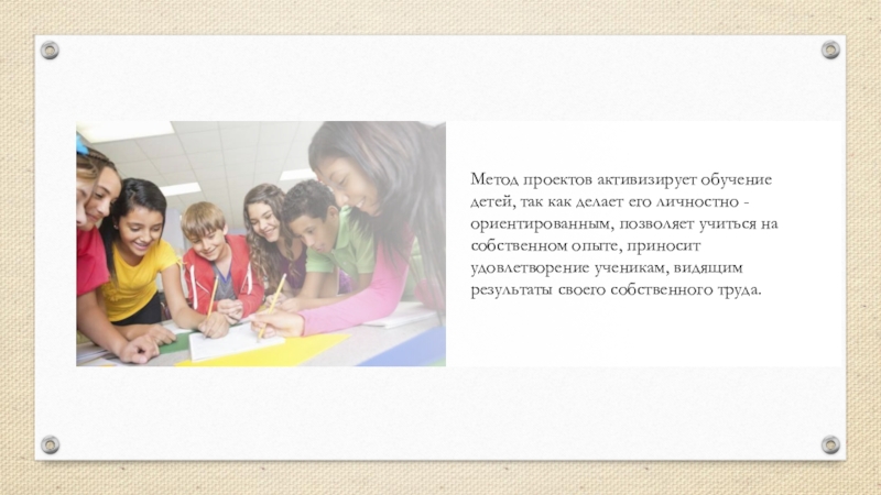 Слайд 42Метод проектов активизирует обучение детей, так как делает его личностно -