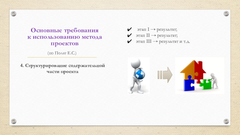 Основные требования к использованию метода проектов(по Полат Е.С.) 4. Структурирование содержательной части проекта этап I → результат;этап