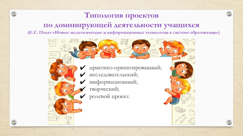 практико-ориентированный;исследовательский;информационный;творческий;ролевой проект. Типология проектов по доминирующей деятельности учащихся(Е.С. Полат «Новые педагогические и информационные технологии в системе образования»)