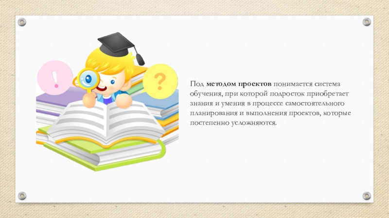 Под методом проектов понимается система обучения, при которой подросток приобретает знания и умения в процессе самостоятельного планирования