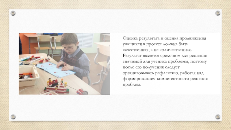 Оценка результата и оценка продвижения учащихся в проекте должна быть качественная, а не количественная. Результат является средством