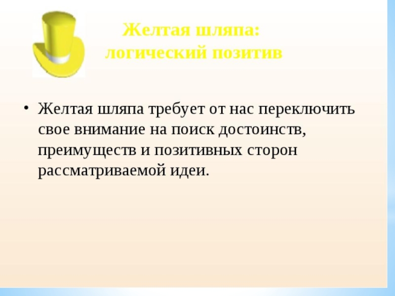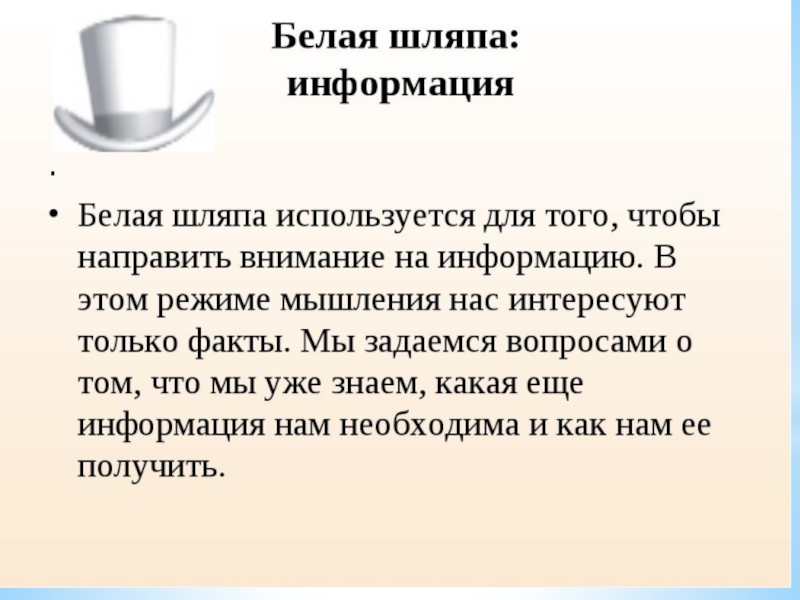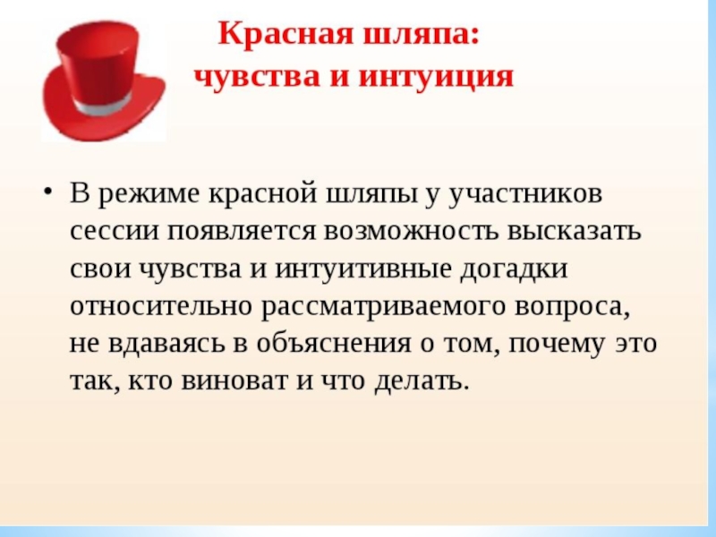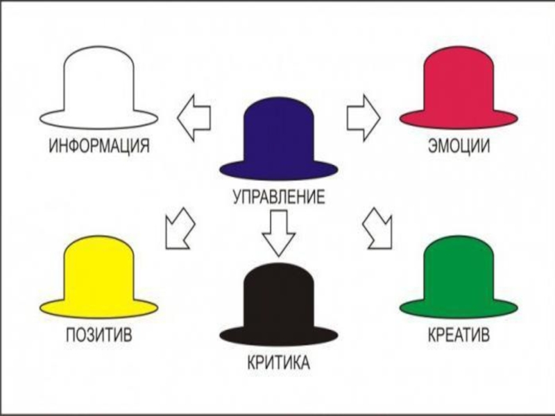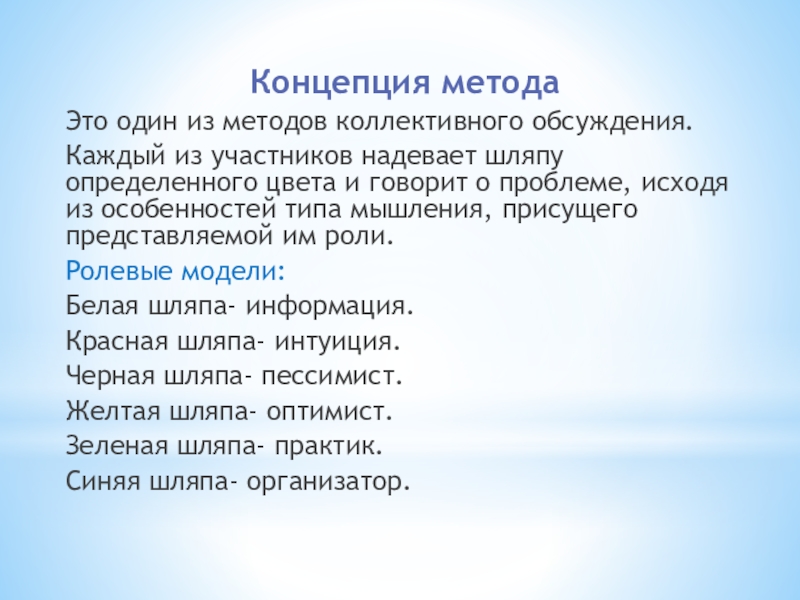 Концепция метода Это один из методов коллективного обсуждения. Каждый из участников надевает шляпу определенного цвета и говорит о проблеме, исходя из особенностей типа мышления, присущего представляемой им роли. Ролевые модели: Белая шляпа- информация. Красная шляпа- интуиция.