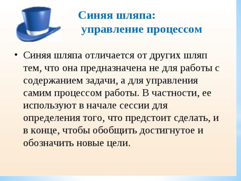 надевает шляпу определенного цвета и говорит о проблеме, исходя из особенностей типа мышления, присущего представляемой им роли.