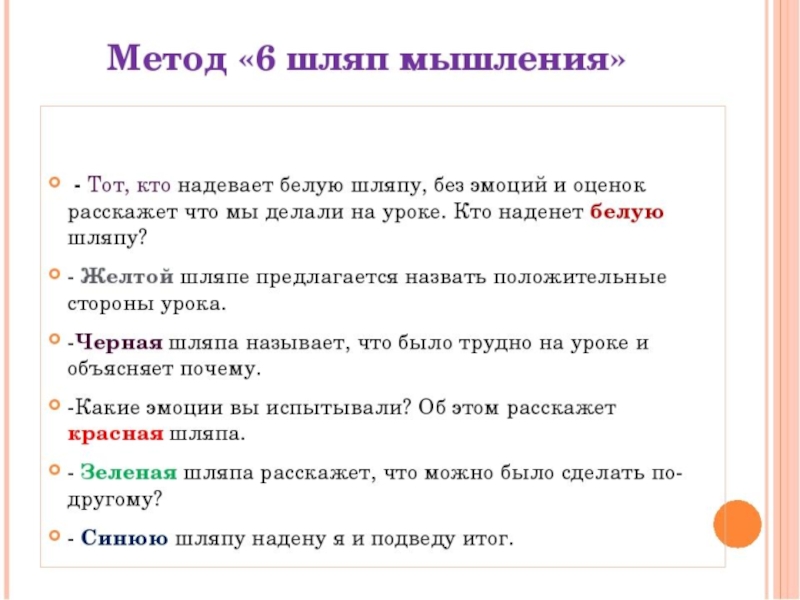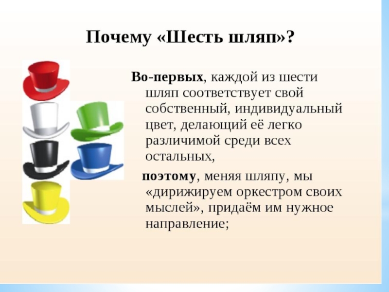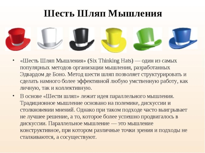 Концепция метода Это один из методов коллективного обсуждения. Каждый из участников надевает шляпу определенного цвета и говорит