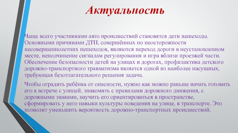 Чтобы оградить ребёнка от опасности, нужно как можно раньше начать готовить его к встрече с улицей, знакомить с правилами дорожного движения, с дорожными знаками, научить его ориентироваться в пространстве, сформировать у него навыки культуры поведения на улице, в транспорте. Это позволит уменьшить вероятность дорожно-транспортных происшествий.