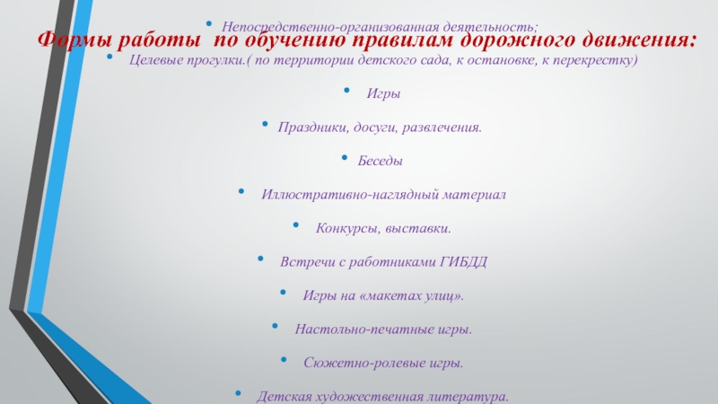 Слайд 8 Формы работы по обучению правилам дорожного движения: