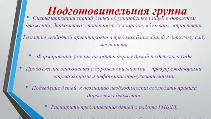 создание в группе условий, оптимально обеспечивающих процесс обучения дошкольников правилам дорожного