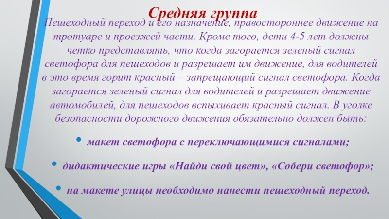 проезжей части. Кроме того, дети 4-5 лет должны четко представлять, что когда загорается зеленый сигнал светофора для пешеходов и разрешает им движение, для водителей в это время горит красный – запрещающий сигнал светофора. Когда загорается зеленый сигнал для водителей и разрешает движение автомобилей, для пешеходов вспыхивает красный сигнал. В уголке безопасности дорожного движения обязательно должен быть: