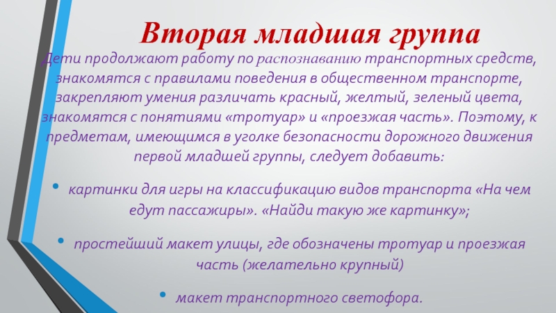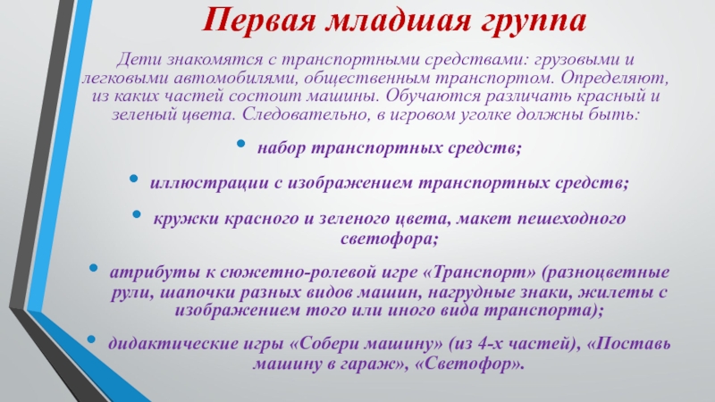правилами поведения в общественном транспорте, закрепляют умения различать красный, желтый, зеленый цвета, знакомятся с понятиями «тротуар» и «проезжая часть». Поэтому, к предметам, имеющимся в уголке безопасности дорожного движения первой младшей группы, следует добавить: