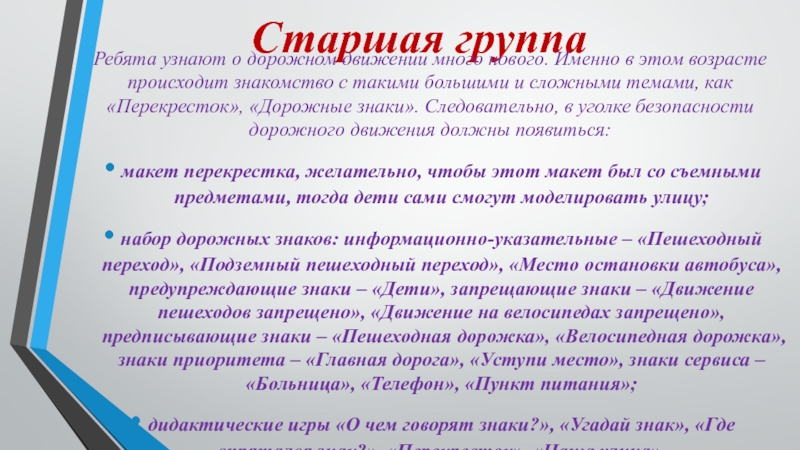 возрасте происходит знакомство с такими большими и сложными темами, как «Перекресток», «Дорожные знаки». Следовательно, в уголке безопасности дорожного движения должны появиться: