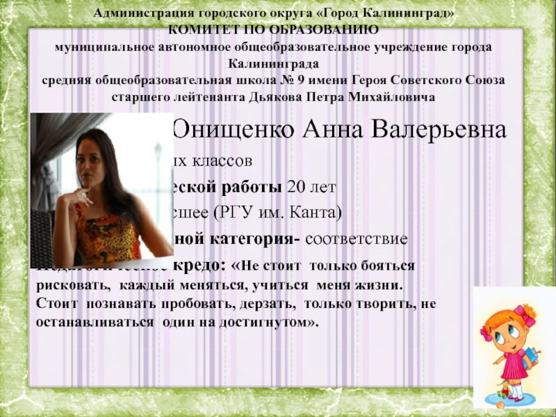 Педагогическое кредо: «Не стоит только бояться рисковать, каждый меняться, учиться меня жизни. Стоит познавать пробовать, дерзать, только творить, не останавливаться один на достигнутом».