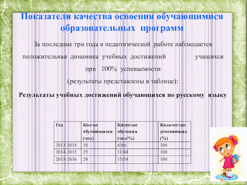 За последние три года в педагогической работе наблюдается положительная динамика учебных достижений учащихся при 100% успеваемости (результаты представлены в таблице):