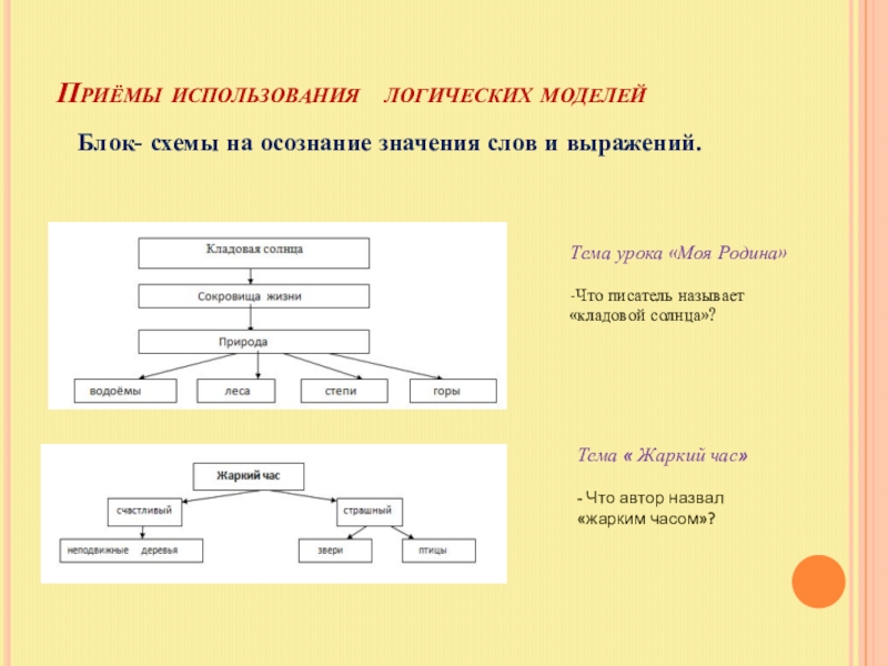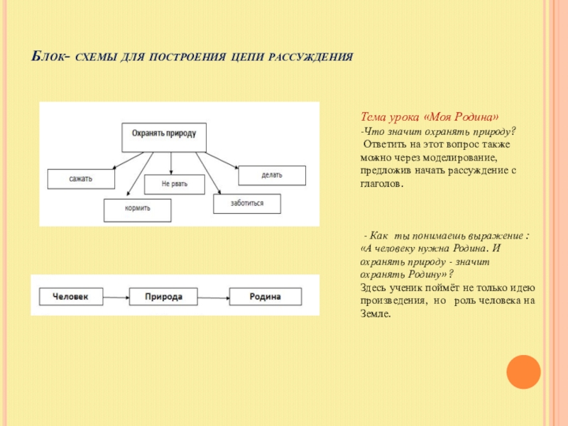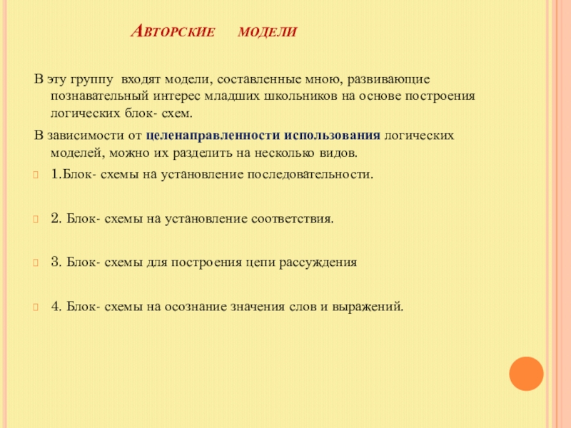В эту группу входят модели, составленные мною, развивающие познавательный интерес младших школьников на основе построения логических блок- схем.