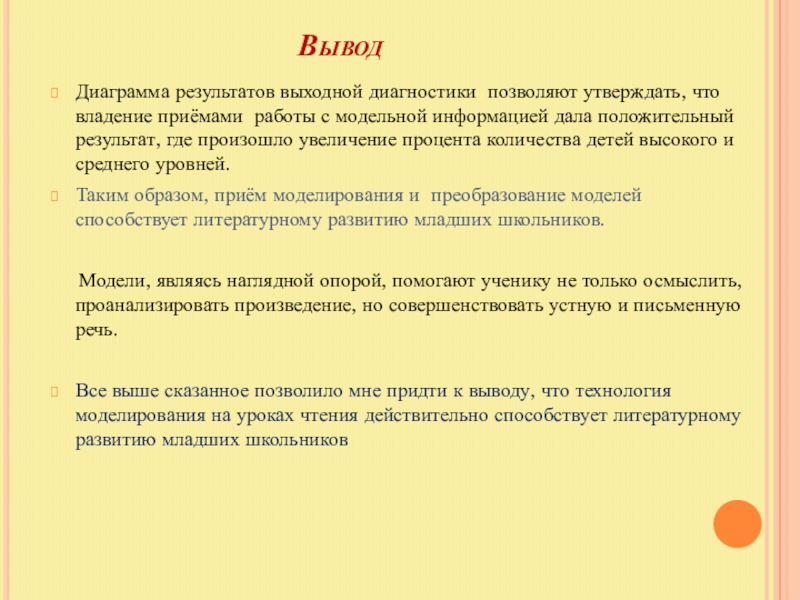 Все выше сказанное позволило мне придти к выводу, что технология моделирования на уроках чтения действительно способствует литературному развитию младших школьников