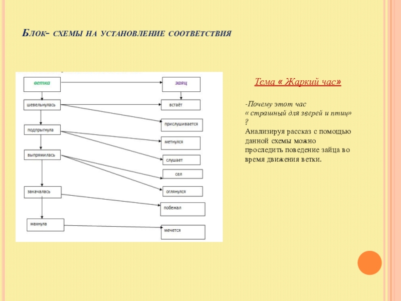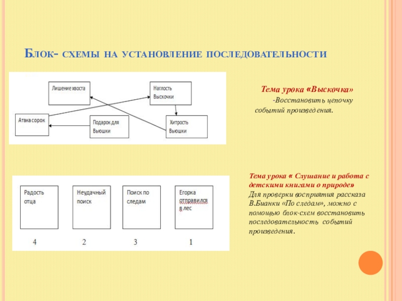 Для проверки восприятия рассказа В.Бианки «По следам», можно с помощью блок-схем восстановить последовательность событий произведения.