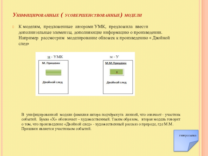 В унифицированной модели фамилия автора подчёркнута линией, что означает - участник событий. Буква «Х» обозначает – художественный. Таким образом, вторая модель говорит о том, что произведение «Двойной след» - художественный рассказ о природе, где М.М.Пришвин является участником событий.